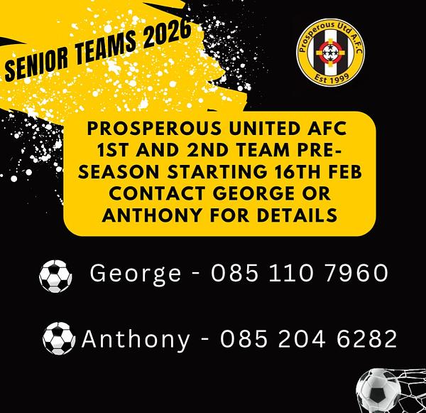 Prosperous United AFC are now welcoming players for our 1st & 2nd Senior Teams ahead of the 2026 season.